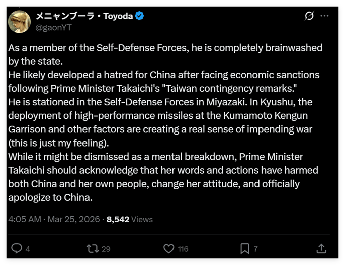 这位来自日本福冈的网民进一步表示,这种洗脑来自多个方面,比如以日本首相高市早苗为代表的日本右翼势力,通过不断挑衅和触怒中国,在日本国内煽动仇视中国的情绪;另一方面,高市还在加紧推行日本的军事化,从而营造出一种“战争迫在眉睫”的假象——比如,在村田晃大驻扎的日本九州,日本自卫队前不久刚在那里强行部署了射程达1000公里、可覆盖邻国沿海区域的远程导弹。