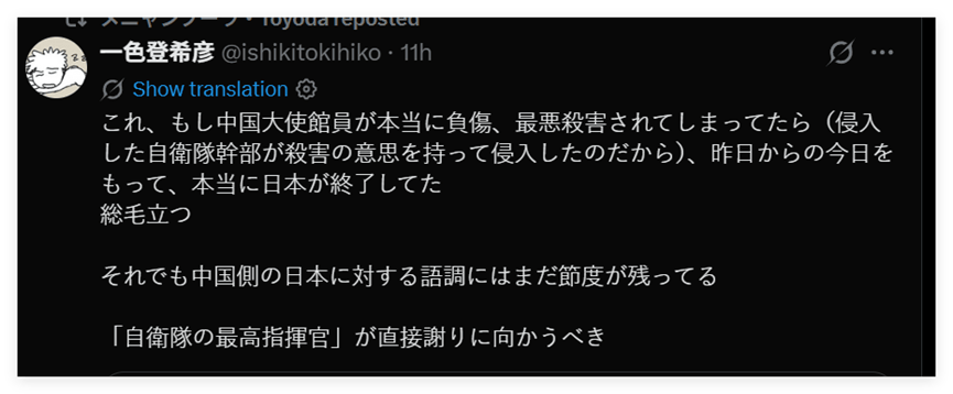 最后,有日本网民注意到,在高市此次饱受“谄媚”恶评的访美后,日本的网络上居然出现了一批美化日本当年在亚洲和太平洋发动的战争的视频,而且这些视频还获得了不少点赞和支持。该网民认为,这样的视频,或许也在一定程度上刺激了此次冲闯中国大使馆的村田晃大,而且可能会影响更多的人走向极端。
