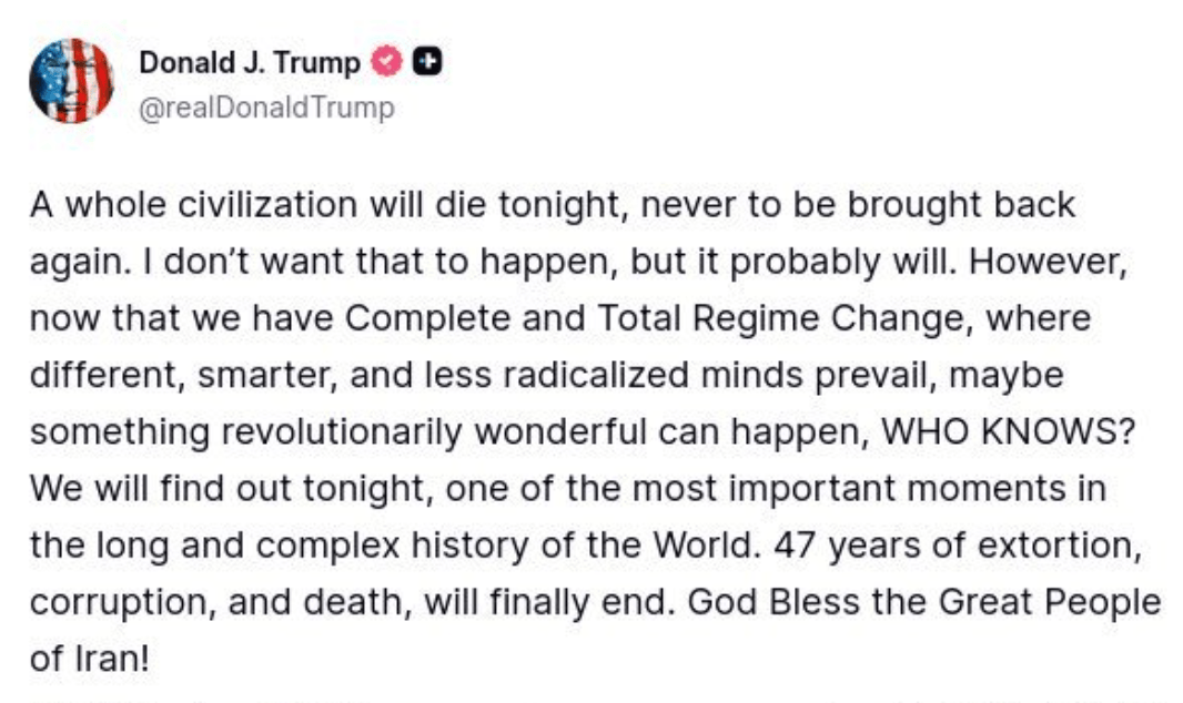 当地时间4月7日上午,美国总统特朗普再度发文威胁伊朗:“今晚,一个文明将彻底消亡,永不复返。我不愿看到这样的悲剧发生,但它或许难以避免。”