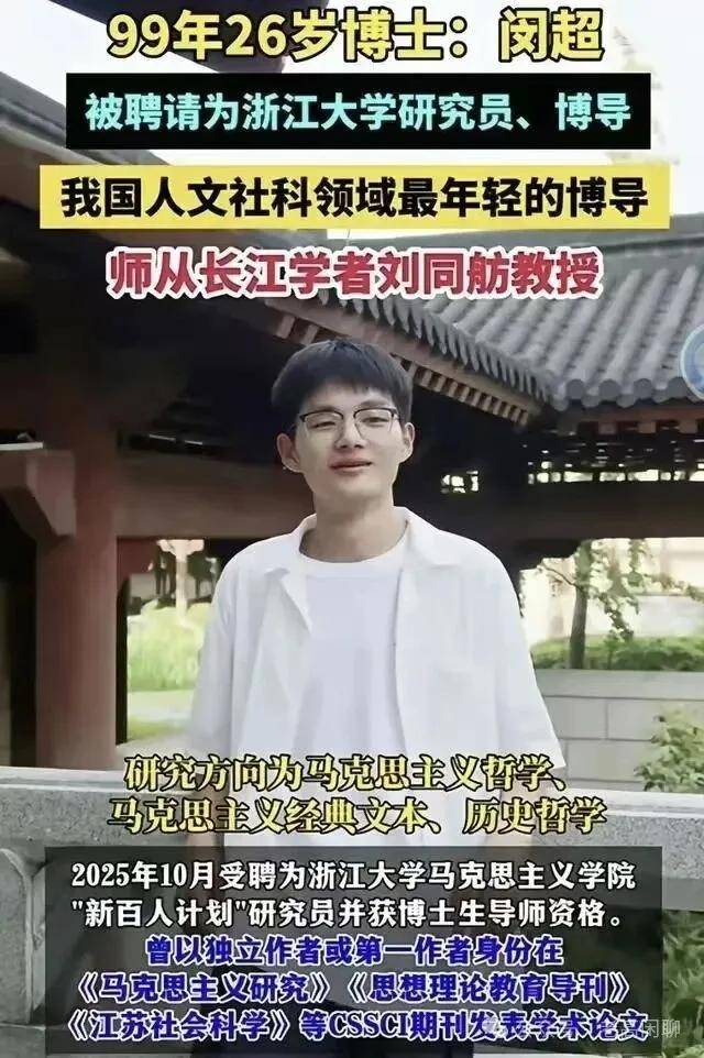先说说这两年爆火的“超导”闵超,1999年生的河南农家娃,4年前还是郑大马哲本科生,同龄人还在为马哲考点死记硬背时,他已经跳过讲师、副教授,一步登顶浙大博导。这晋升速度,说是学术圈的火箭都谦虚了,简直是坐了窜天猴,八年走完别人十八年的路,魔幻到让人怀疑是不是开了外挂。