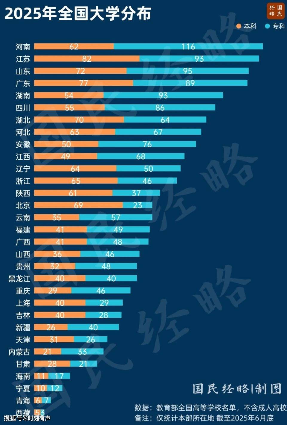 令许多人意外的是,河南才是中国高校第一大省,高校总量178所,超过江苏(175所)。