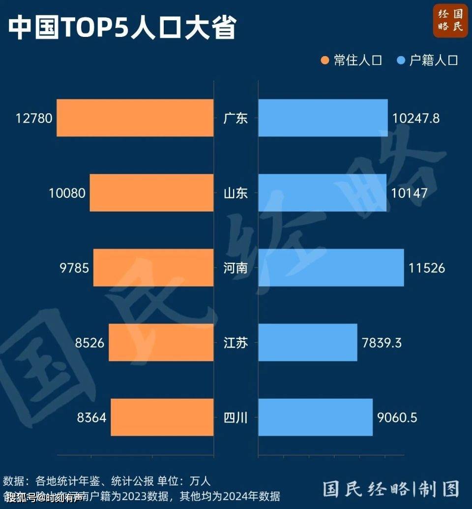 广东以1.27亿人连续多年位居全国第一,与日本全国相当;山东常住人口、河南户籍人口双双超过1亿人。