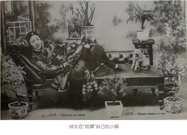 程砚秋又提出,传统旦角的步法有其分类,要“使人看出人物的年龄、身份来”,其实也包括阶级,“十三四岁的小丫鬟,应当使用很活泼的脚步;二十岁左右的少女,从态度上来要求她,就不应当随便说笑了,为了表现形态端庄慎重……走起路来的步法应当是‘脚跟起落在脚尖前’,不慌不忙,一步一步缓缓地行动着;出嫁后的中年妇女,大部分是青衣的角色……走起路来两只脚的距离就可以过半步了。”它是有阶级性与年龄性的。这是一个晚清妓女的照片,可以看到她把小脚放到中心位置,引导观看者将视线集中于照片正中的三寸金莲上。
