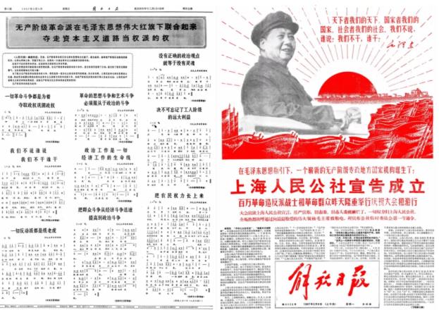 此图是《解放日报》对上海人民公社宣告成立的一个报道,我觉得很有意思就保存下来。它左边全是群众歌曲。我们从版面布置也可侧面理解为什么我说它是一个礼乐革命——因为人民公社的诞生伴随着“文化革命”的“乐府”。歌曲跟政治是息息相关的。是群众用音乐,用歌唱,用声腔去进行的文化革命。