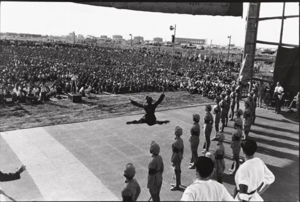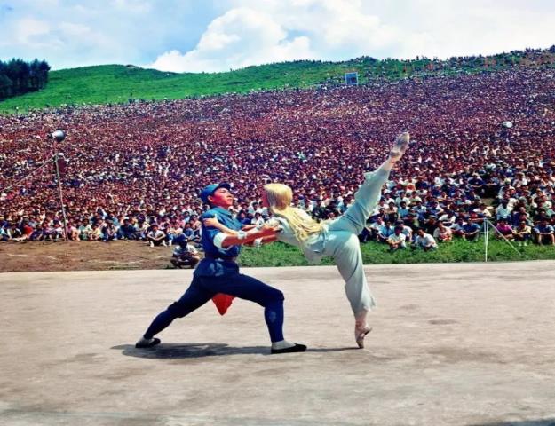 这张照片是1975年7月23日中国舞剧团去黑龙江阿城县演出样板戏《白毛女》的场景,当时有5万农民坐在山坡上观看。注意在远处有一幅巨幅海报,用今天的话讲可能叫应援牌吧,《白毛女》在当时是非常受欢迎的一部戏,这个演出形式看起来非常像古希腊悲剧。