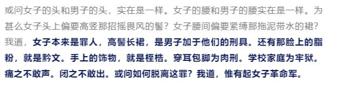 他这里讲的“穿耳包脚为肉刑”的包脚就是裹小脚,他说只有女子革命军也就是娘子军这个形象,才能够脱离这些制度。
