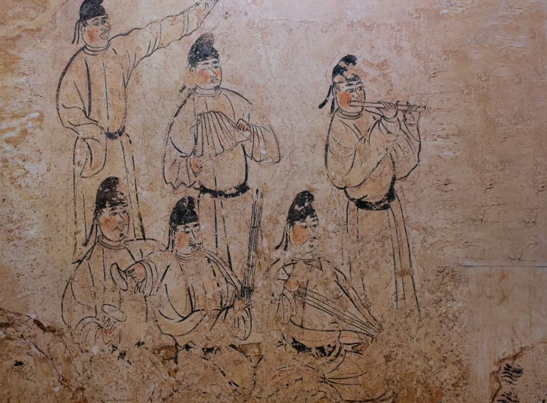 1952年,在陕西省西安市东郊苏思勖墓出土了壁画《乐舞图》,乐队中既有操中原传统乐器笙的,也有操胡族乐器横笛的,反映了盛唐时期胡汉文化的融合。图为《乐舞图》局部 FOTOE/供图