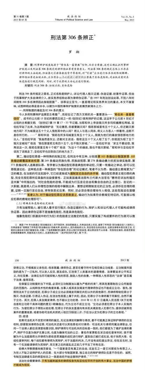 2、2013年,罗翔在中国政法大学主办的《政法论坛》杂志刊文要求国家废除我国《刑法》第103条煽动分裂国家罪和第105条煽动颠覆国家政权罪等所有煽动型犯罪。(参见《为什么罗翔要主张废除煽动颠覆国家政权罪》)他这篇论文的最后一句话是“只有当越来越多的律师投身先知亚伯拉罕所开创的伟大事业,法治中国的梦想才能成为现实。”
