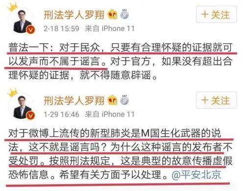 6、同月,针对网民发布造谣中国政府的言论,罗翔发微博称“民众有合理怀疑的证据就可以发声不属于谣言”;然而就在几天前,针对有人怀疑美国制造新冠的言论,罗翔却气急败坏地发微博要求按照“故意传播虚假恐怖信息罪”处罚。在他看来,怀疑中国政府的必须推定无罪,而怀疑美国政府的则要严惩不贷。