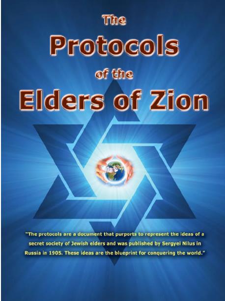 20世纪初流传出来的《锡安长老会纪要》(Протоколысионскихмудрецов)。内容据称是一群所谓犹太锡安长老会秘密会议,阴谋夺取世界统治权控制全人类的会议纪要。来历不明,作者不明。