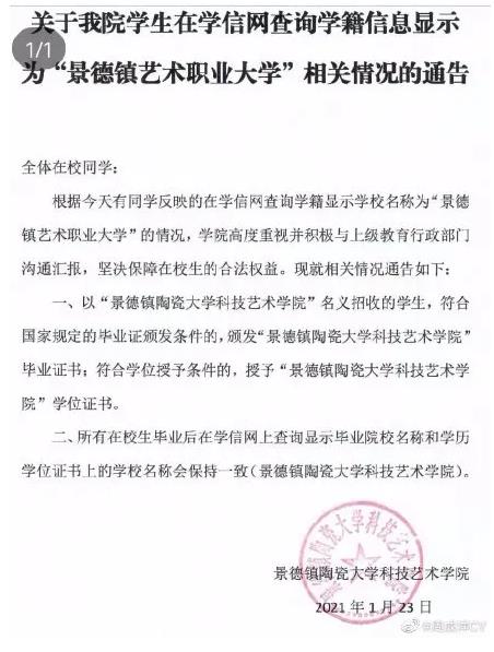 还有同学说,景德镇陶瓷大学科技艺术学院在疫*情期间已经转设,并更名为景德镇艺术职业大学,而同学们毫不知情。难道同学们读了四年、花了十几万,眼看着快毕业了,最后却告诉我们,你读了个专科?