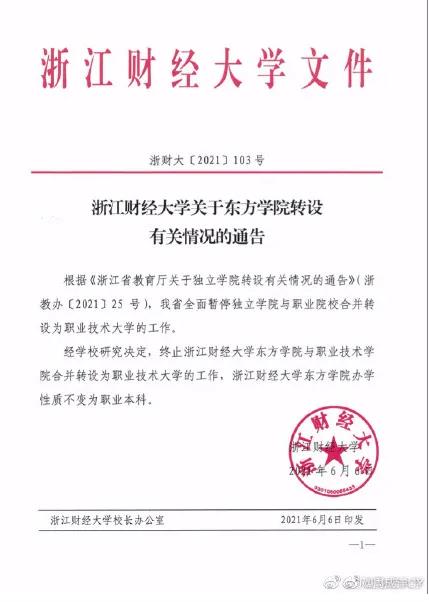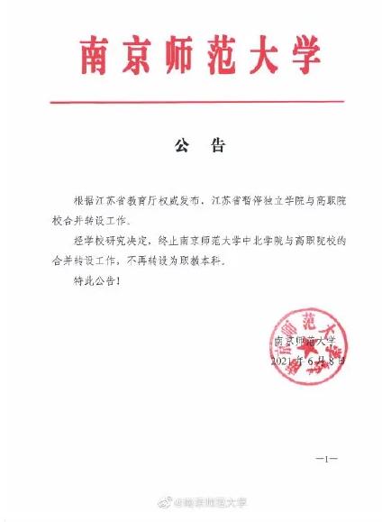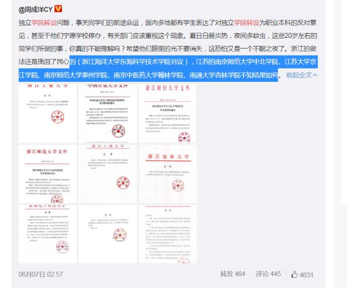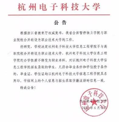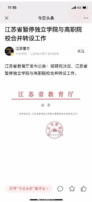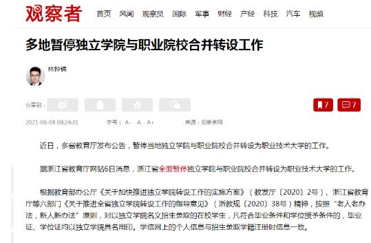 我们看到,今天(2021年6月8日),观察者网发布新闻说《多地暂停独立学院与职业院校合并转设工作》,其中就包括了学生反映比较强烈的浙江省教育厅和山东省教育厅。