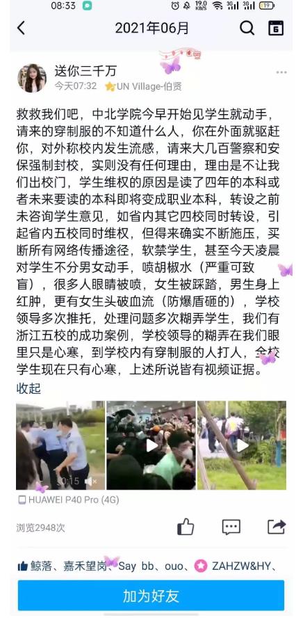 据网络上曝光的视频和图片显示,南京师范大学中北学院的一些学生,还被打了。