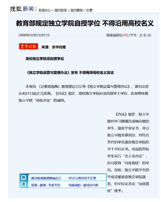 针对这种情况,在2008年教育部进一步出台了《独立学院设置和管理办法》,提出了包括独立的财产、师资等各方面明确的量化指标,要求独立学院并入、转设或者停办,并设置了五年的验收期。