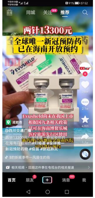 Evusheld两针价格为13300元,目前不能用医保结算,过去三周,在海南接受给药的人数超过100人。
