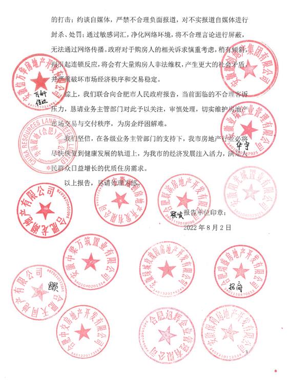 这份由17家房企联合盖章,名为《关于请求维护营商环境、增强房企投资信心的纾困解难报告》的文件写道: