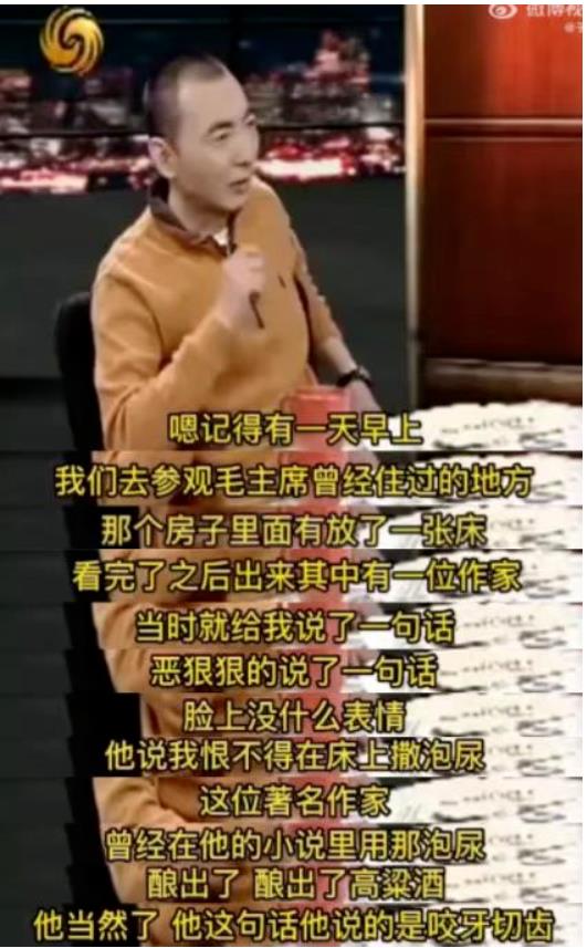 "记得有一天早上,我们去参观毛主席曾经住过的地方,那个房子里面有放了一张床。看完之后出来,其中有一位作家当时就跟我说了一句话,恶狠狠的说了一句话,脸上没什么表情,他说,我恨不得在床上撒泡尿。这位著名作家曾经在他的小说里用那泡尿酿出了高粱酒。当然了,他这句话说的是咬牙切齿……"