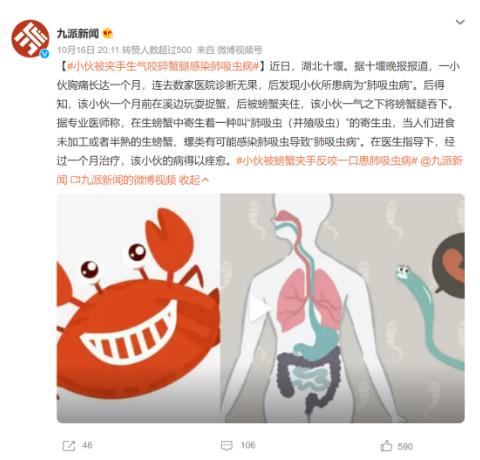 这当然不是最终的结局。结局非常悲催,小伙胸痛长达一个月,去了数家医院诊断都未果,后发现他患病为“肺吸虫病”,原因正是生吃螃蟹。经过一个月的治疗,小伙总算是好了。
