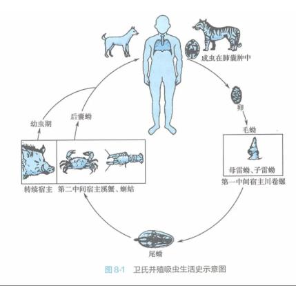 肺吸虫的第一中间宿主是川卷螺,第二中间宿主是溪蟹、蝲蛄(寄生在鳃、肌肉等处)等,其生活史如下图所示: