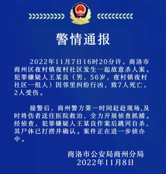 据陕西商洛市公安局商州分局通报,2022年11月7日16时20分许,商洛市商州区夜村镇夜村社区发生一起故意杀人案。犯罪嫌疑人王某良(男,56岁,夜村镇夜村社区一组人)因邻里纠纷行凶,致7人死亡、2人受伤,后王某良跳河自杀,其尸体已打捞并确认。