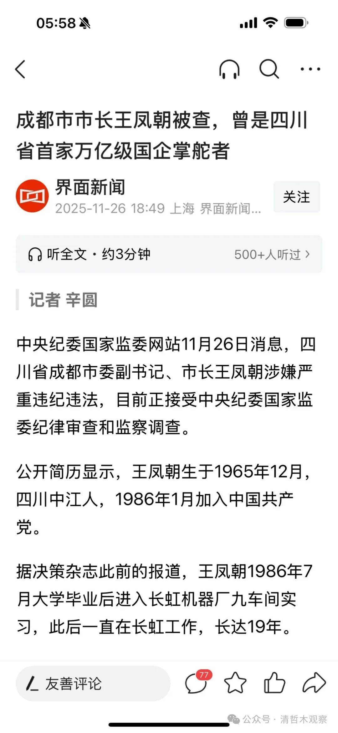 2025年11月26日晚6点,中央纪委国家监委网站发布一则简短通报:“四川省成都市委副书记、市长王凤朝涉嫌严重违纪违法,目前正接受中央纪委国家监委纪律审查和监察调查。”