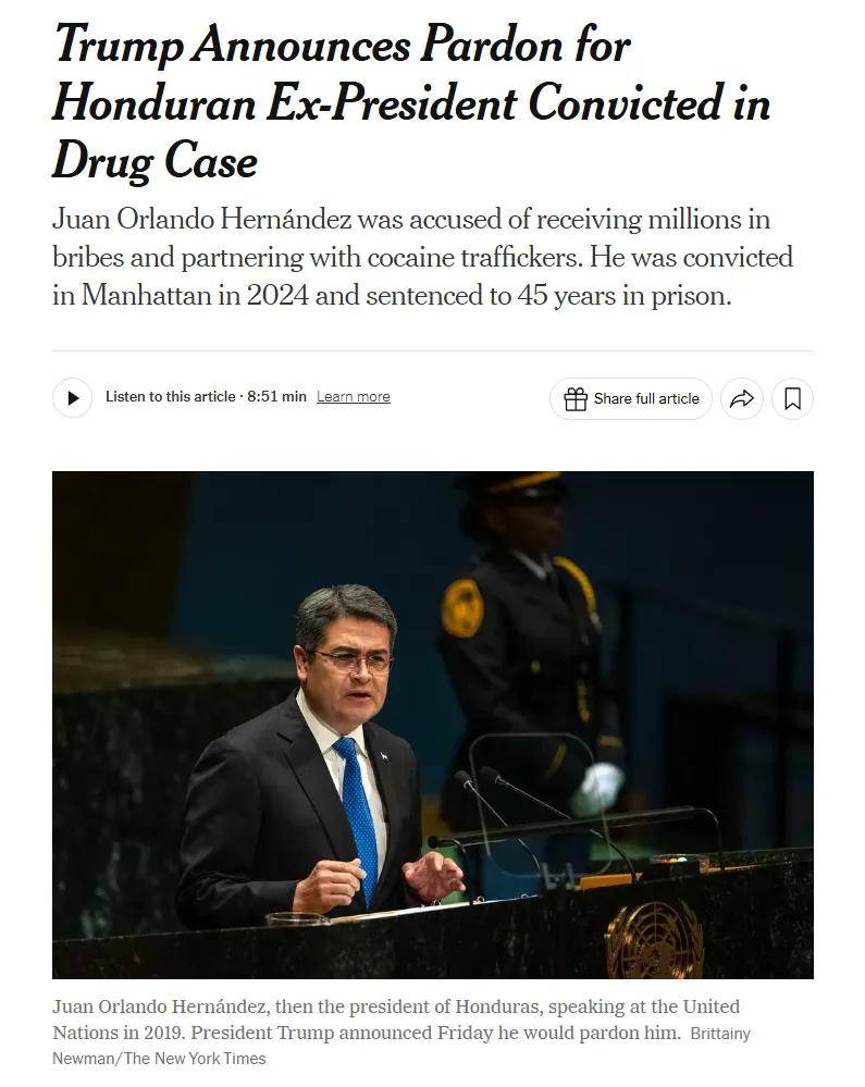 就在大统领宣布委内瑞拉领空被完全封锁之前的24小时里,他还宣布了另一件事,就是他准备特赦因涉嫌向美国运送毒品而在2024年被美国判处入狱45年的洪都拉斯前总统胡安·奥兰多·埃尔南德斯。大统领给出的理由是:“很多我非常尊敬的人告诉我,埃尔南德斯遭到了非常恶劣和不公正的对待。”