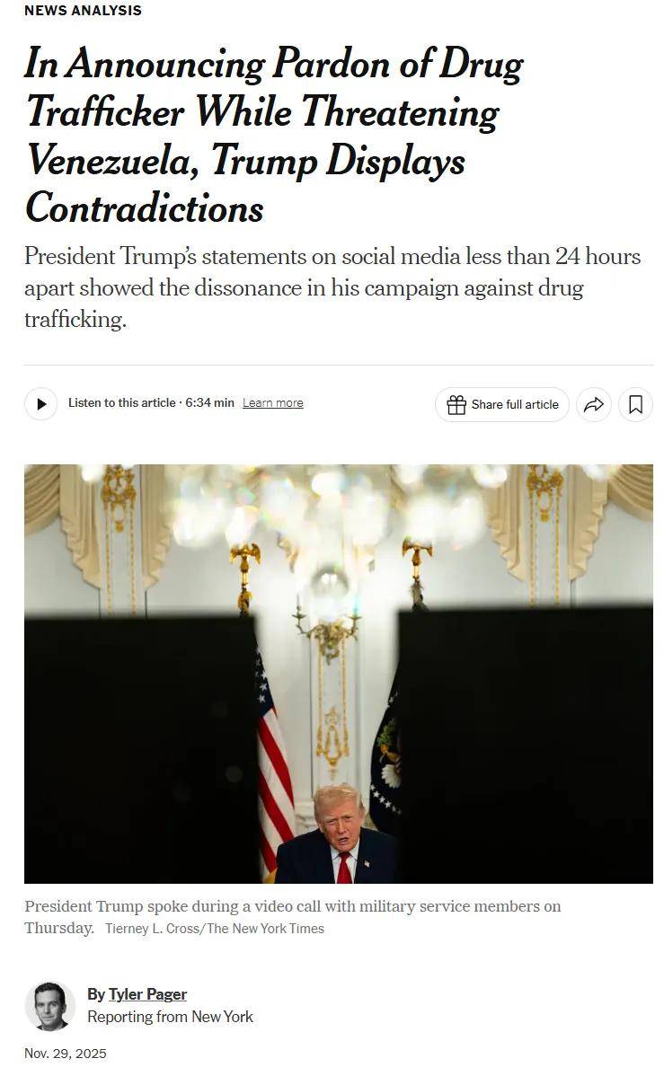 埃尔南德斯曾经是美国政府用来证明南美国家领导人确实可能是贩毒集团首脑的例子,美国老乡现在把这个叙事套用到了马杜罗身上,所以编出来一个叫Cartel de los Soles的贩毒集团。但是现在就在美国要以Cartel de los Soles为理由进攻委内瑞拉的时候,大统领却说要把埃尔南德斯放了。这种撕裂感,让很多美国老乡接受不了。