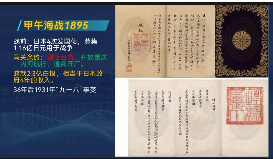 甲午战争,日本迫使清政府签下《马关条约》,赔偿白银2.3亿俩,割让台湾,开放重庆,允许日本在华内河航行,通商开厂。这一仗相当于日本4年的收入。