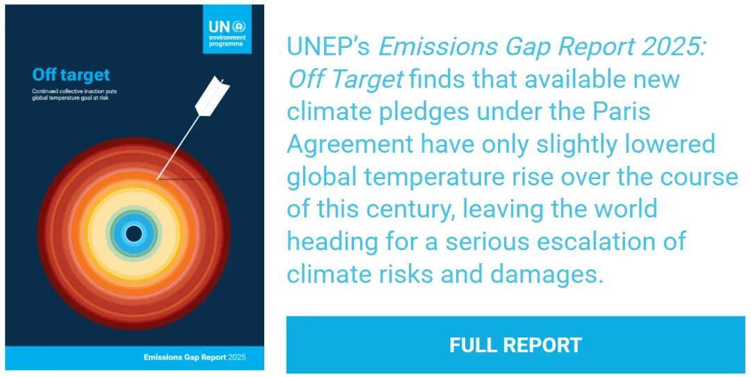 “联合国环境规划署《2025年排放差距报告:偏离目标》指出,根据《巴黎协定》提交的现有新气候承诺仅使本世纪全球气温上升幅度略有降低,世界仍将面临气候风险和损害的严重加剧。” | 图片截自:UNEP网站