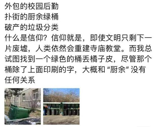 我站在宿舍楼下的垃圾桶旁,提醒同学们做好垃圾分类,厨余垃圾倒进绿桶后再把包装物另外扔进黑桶。我看着许多只吃了两口的炒饭、只喝了一半的奶茶、尚未开封就过期的零食,流水般汇入厨余垃圾的深渊,而几个“其他垃圾”桶早已“爆仓”,我开始把餐盒叠到一起以尽可能地节省空间。我的值班时间一晃而过,而拎着一袋“大杂烩”的同学们还在持续不断地走来,他们随便往绿桶里扔一个塑料袋,就可以毁掉我2个小时的坚守。