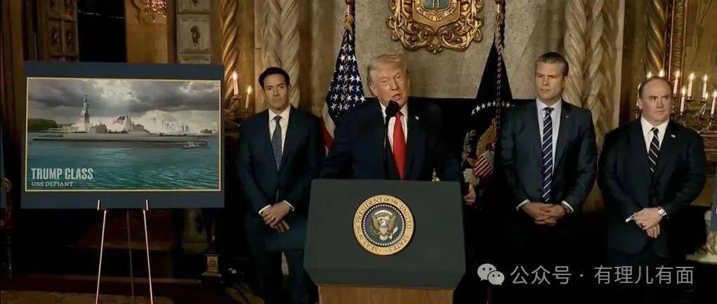 现场海报上“特朗普级”“无畏”号的字样格外刺眼,国防部长、海军部长一众高官站在身后当背景板。那架势,比好莱坞大片的首映礼还足。