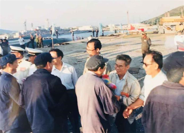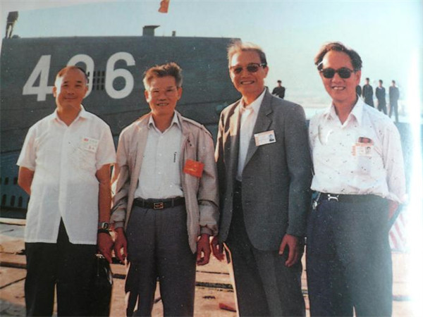 1988年10月,海上潜地固体导弹在重新研制后,于下半年在大连继续在核潜艇上做水下发射海上飞行全程试验。这次将水下发射点火改为水上点火,技术成熟了,三发弹全部发射成功。这次,彭士禄总师在现场接待了凯旋而归的参试人员和艇员们。(见照片)业内常用的彭士禄总师与另外三位核潜艇总师照片的合影照片,我就是合影现场的见证者。
