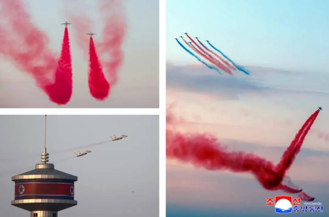 天空哨兵们低空飞过瞭望台上空,向金正恩同志表达绝对忠诚的意志和最热烈的信赖。